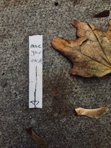 This afternoon I spotted a temporary art installation on the pavement outside of the goods lift door at Maid Of Orleans Studios. Materials – concrete, sycamore leaves and seeds, camera tape, sharpie.